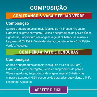 - Com frango&vaca de elevada qualidade como fonte de proteína e ótimo sabor.